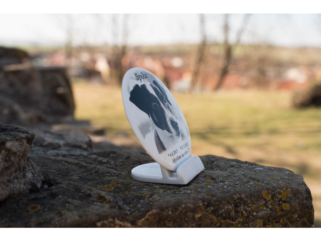 Porcelánový stojánek a fotografie. Vhodný do urnových schránek.